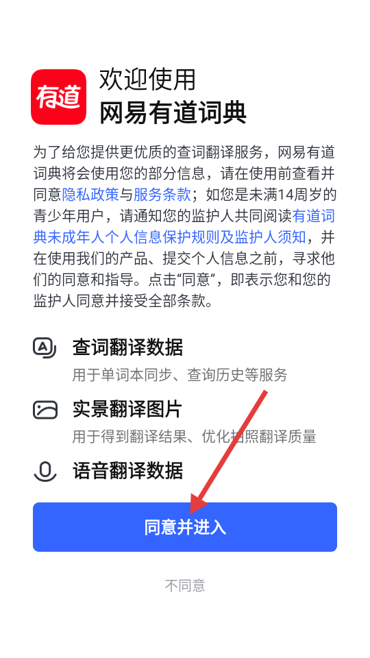 1、在网易有道词典的欢迎页面,点击【同意并进入】按钮,进入软件主界面。