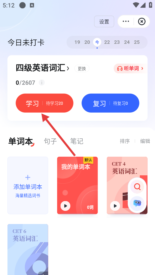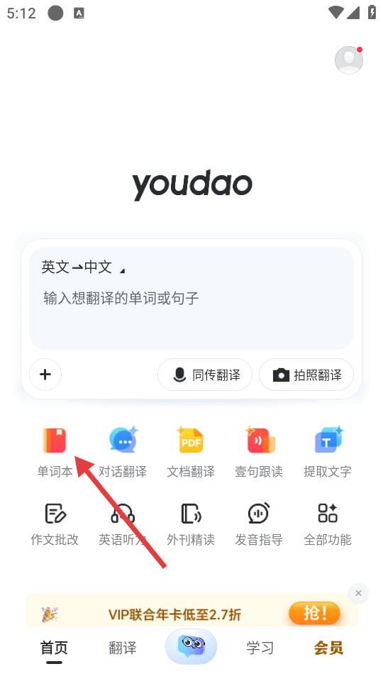 2、在主界面,点击【单词本】选项,进入单词本页面。