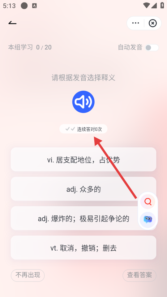 4、在单词学习界面,根据发音选择正确释义,完成本组单词的学习任务。