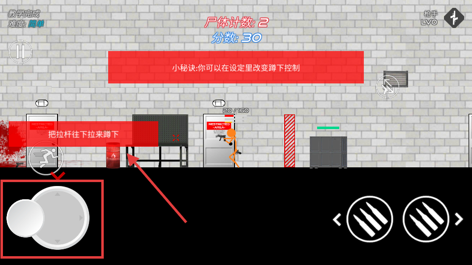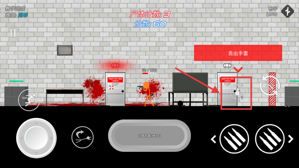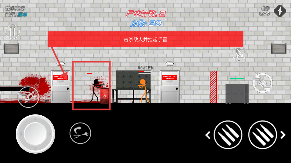 3、击杀黑色火柴人敌人,靠近其掉落物拾取【手雷】,增强范围攻击能力应对集群敌人。