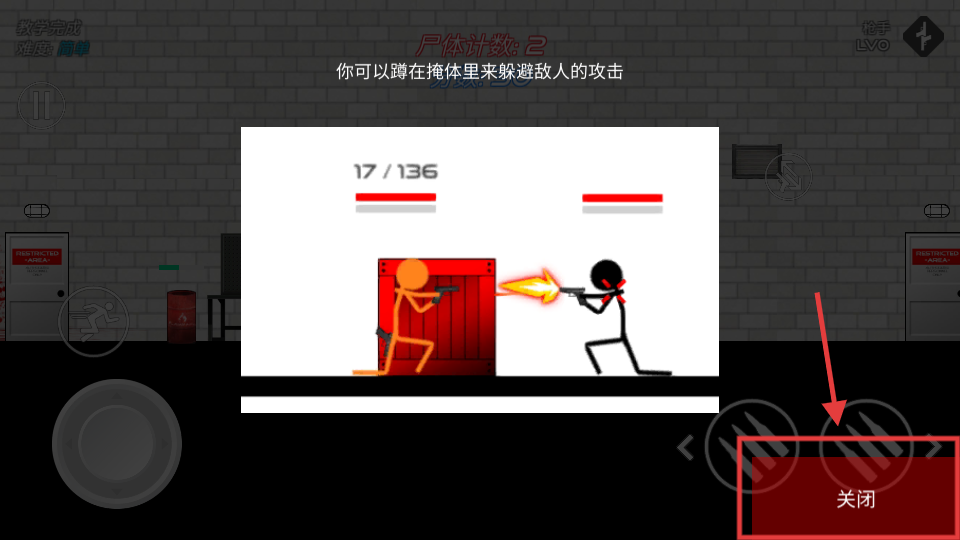 2、点击【关闭】按钮关闭教学提示,利用掩体躲避敌人射击,保障自身战斗安全。