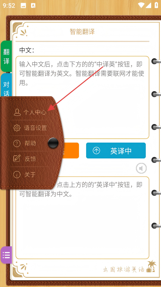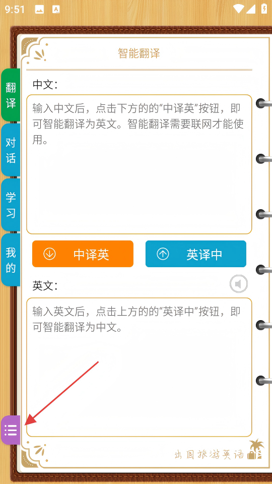 1、在智能翻译页面,点击左下角菜单按钮,可展开功能选项列表。