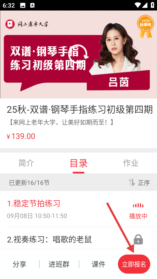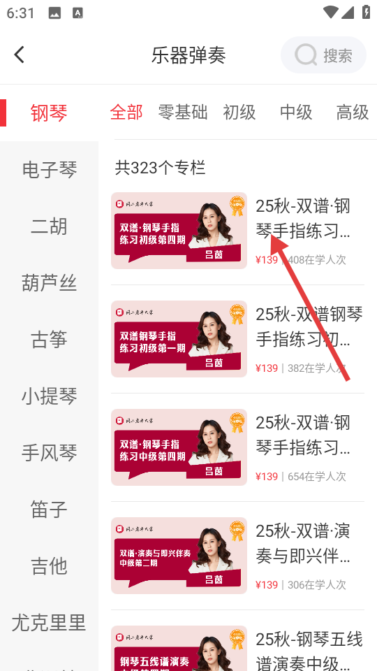 3、在乐器弹奏课程列表中,找到【25秋-双谱·钢琴手指练习初级第四期】课程,点击进入课程详情页面。