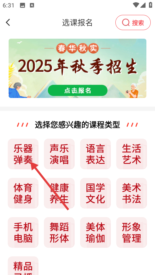 2、在选课报名页面,选择【乐器弹奏】课程类型,进入乐器弹奏课程列表页面。