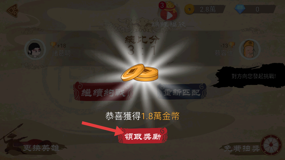 4、对战胜利后,点击【领取奖励】按钮,获得金币奖励,积累游戏资源。