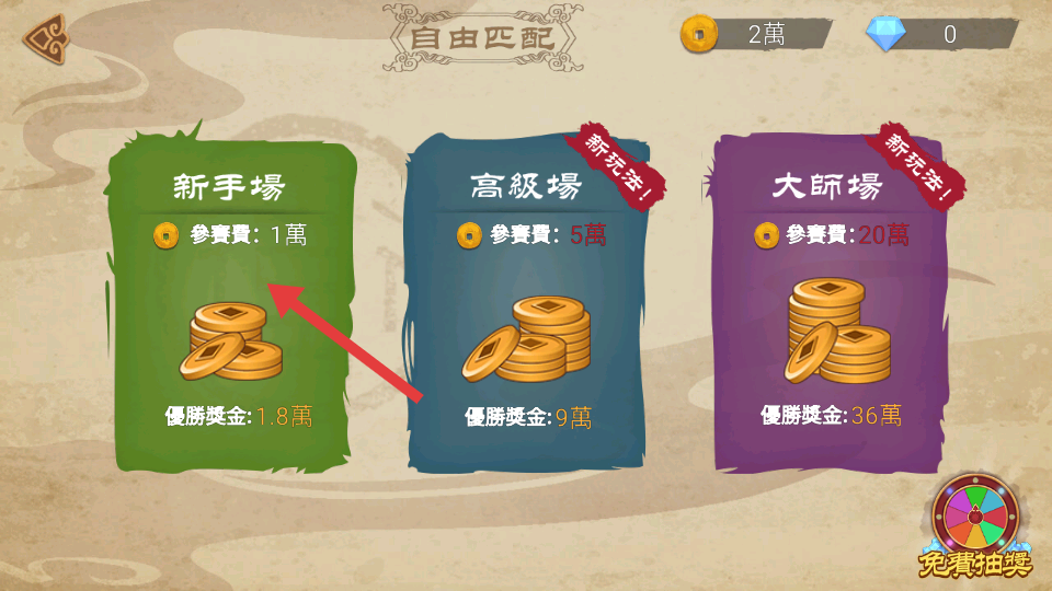 1、选择新手场,花费【1万】参赛费,参与对战,争取获得优胜奖金。