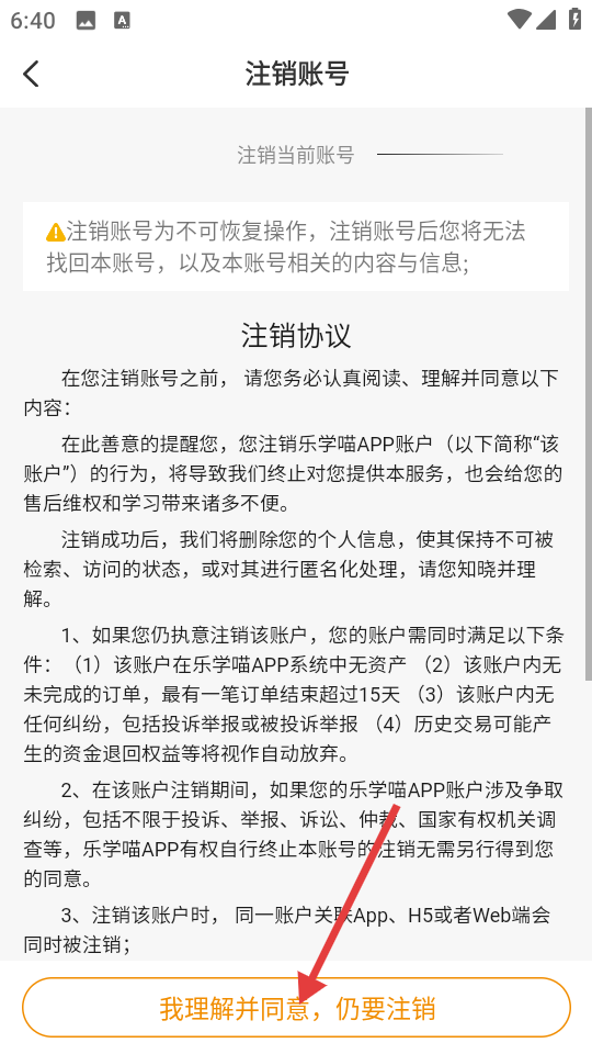3、在注销账号说明页面,点击【我理解并同意,仍要注销】按钮,进入账号验证页面。