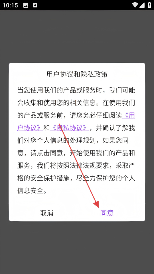 1、在用户协议和隐私政策弹窗中,点击【同意】按钮,可进入软件主界面使用服务。