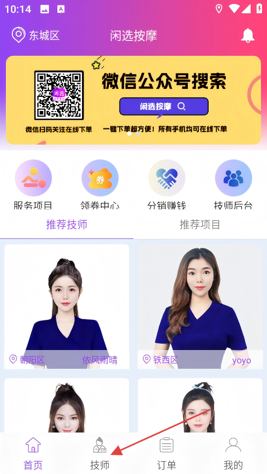 2、在首页底部导航栏点击【技师】选项,可进入技师列表页面选择技师。