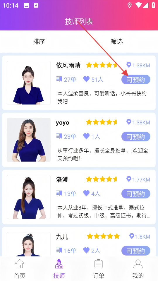 3、在技师列表中,点击技师旁的【可预约】按钮。