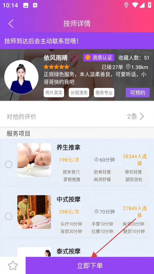 4、在技师详情页,选择服务项目后,点击【立即下单】可完成按摩服务的下单操作。
