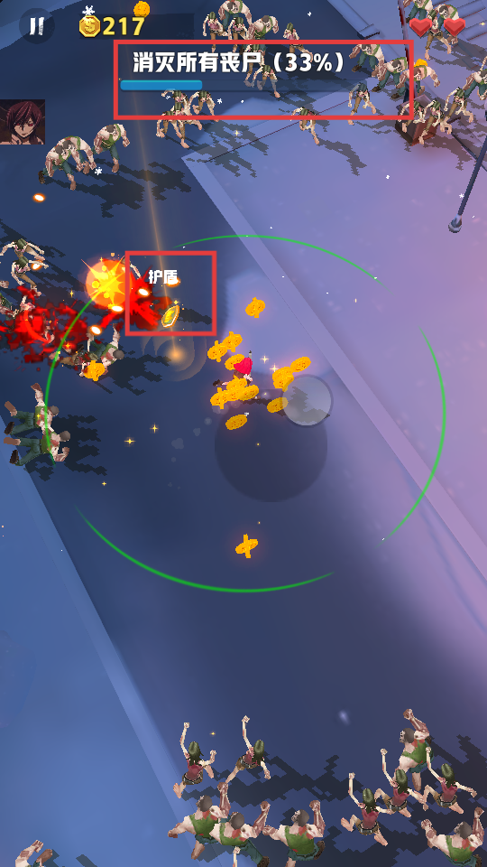 3、持续消灭丧尸,注意收集护盾等道具,提升消灭丧尸的进度,同时积累金币。