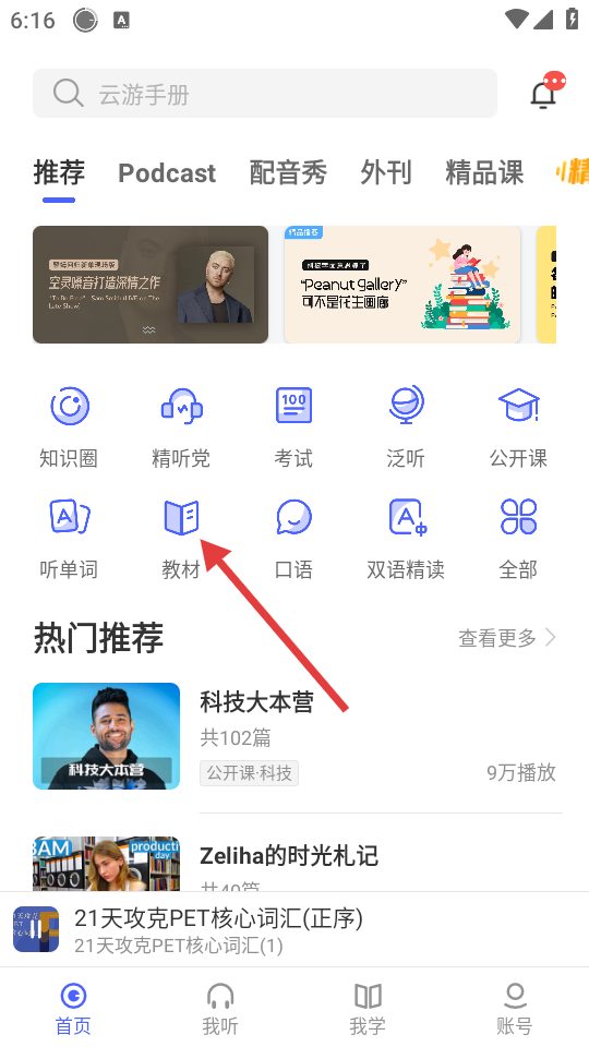 1、在软件首页,点击【教材】选项,进入教材板块页面。