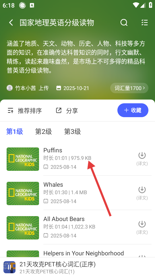 3、在读物列表页面,选择【Puffins】读物,进入其详情页面。