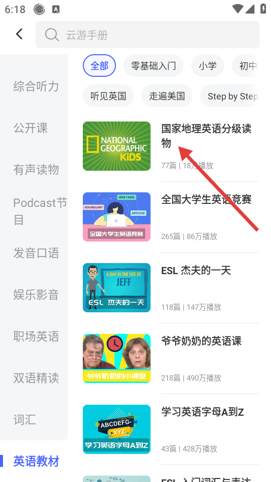 2、在教材板块页面,找到【国家地理英语分级读物】,点击进入该读物列表页面。