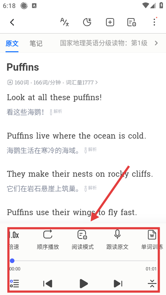 4、在详情页面,可利用播放控制栏调整语速、播放模式等,学习关于海鹦的英语内容。