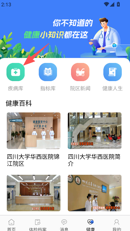 2、进入健康板块,可点击疾病库,获取健康小知识等内容。