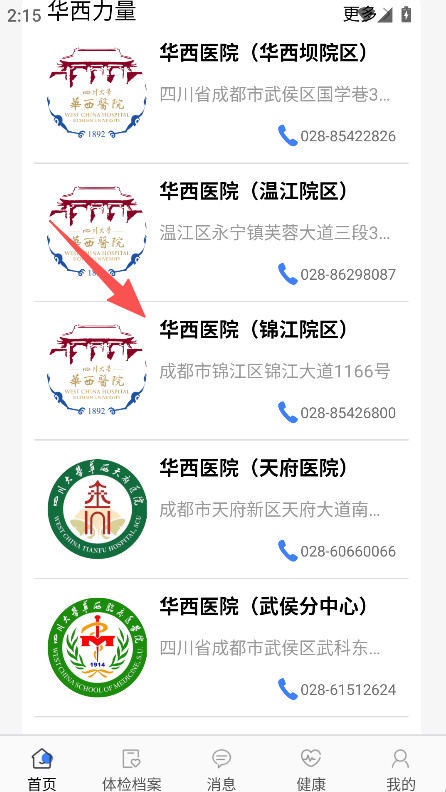 3、在院区列表里,能找到华西医院各院区地址和联系电话,方便就医咨询。