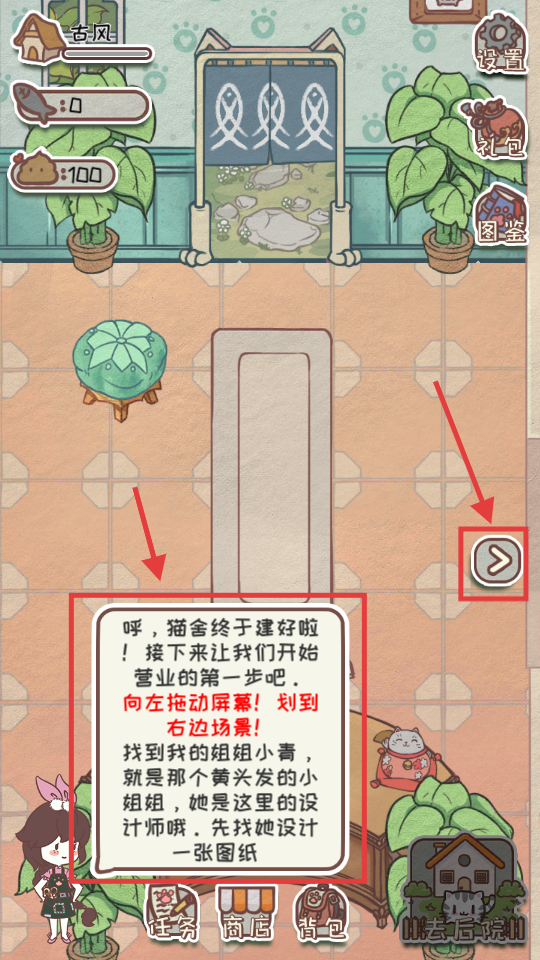 1、根据指引向左拖动屏幕到右侧场景,找到小青设计师,开启设计图纸的营业第一步。