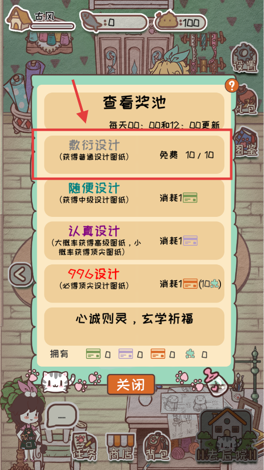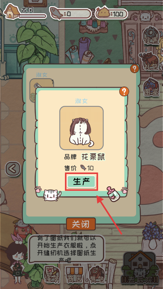4、拥有图纸后,点击【生产】按钮,制作【花栗鼠】品牌【淑女】款猫咪衣服,售价10获取收益。