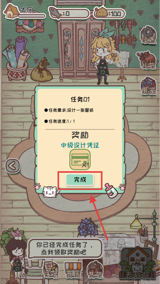 3、完成设计图纸任务后,点击【完成】按钮,领取【中级设计凭证】,推进任务进度。
