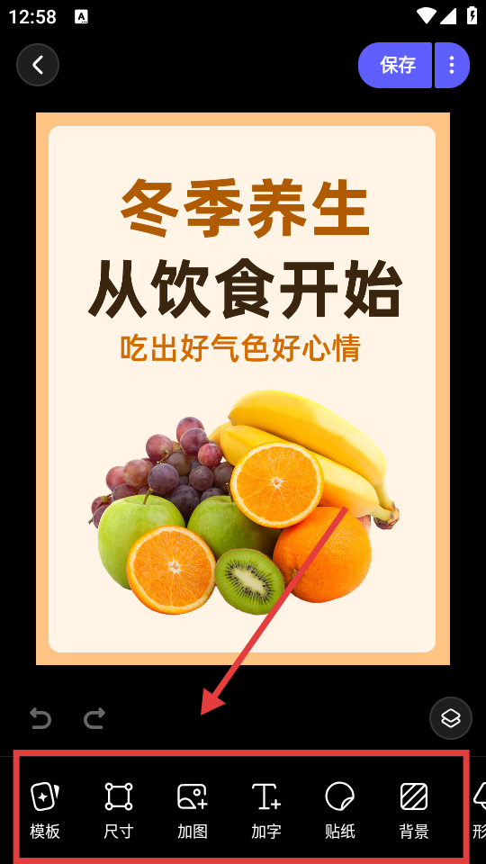 4、在编辑页面,可利用模板、尺寸、加图、加字等功能进行设计,完成后点击【保存】按钮即可。