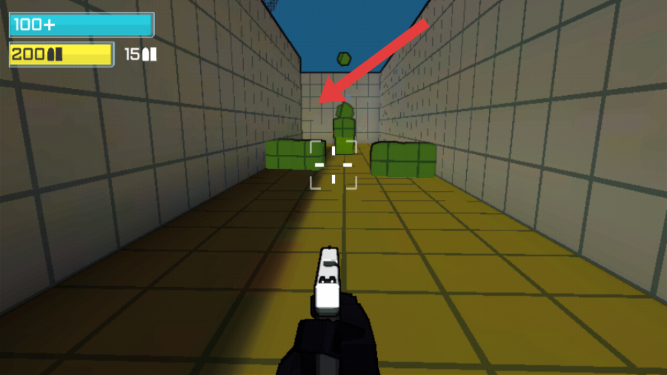 2、在游戏场景中,瞄准箭头指向的绿色目标射击,通过击碎目标获取资源或推进关卡。