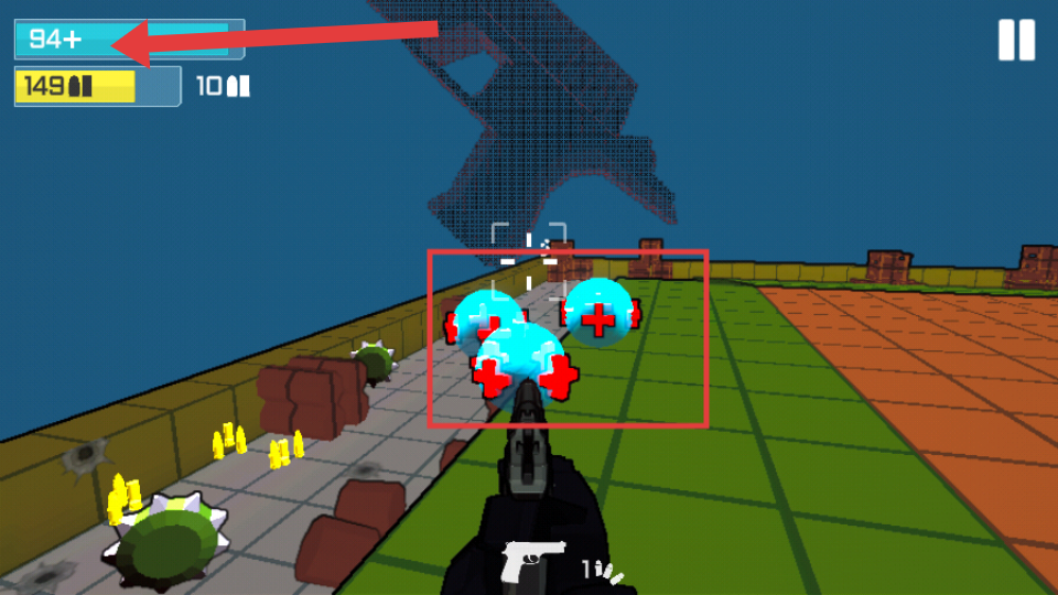 3、当左上角显示【94+】时,射击带有红十字的蓝色球体,可恢复生命值,维持生存状态。