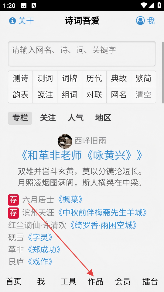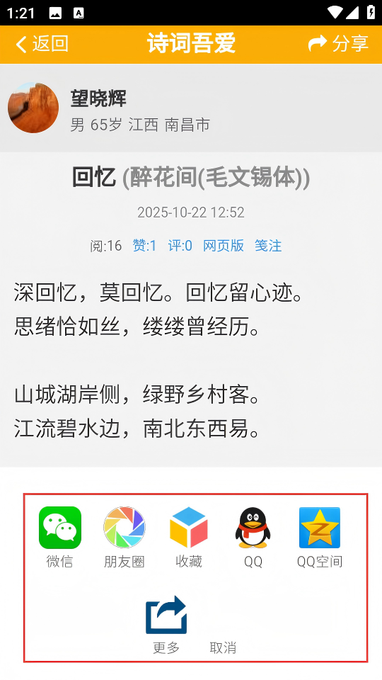 3、设有个人空间模块,用户可发表原创作品,还能对他人作品评论点赞分享,参与作品排行,展现个人诗词创作成果。