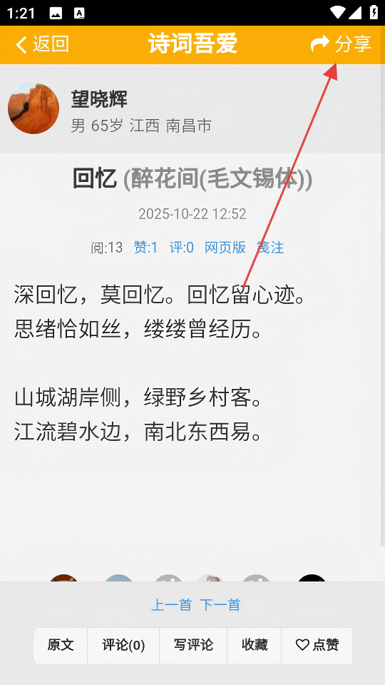 3、在诗词详情页,点击右上角【分享】按钮,可弹出分享选项列表。