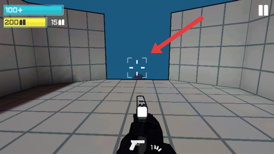 1、游戏开始时,瞄准箭头指向的目标射击,开启探索与战斗,注意左上角【100+】和【200】的资源状态。