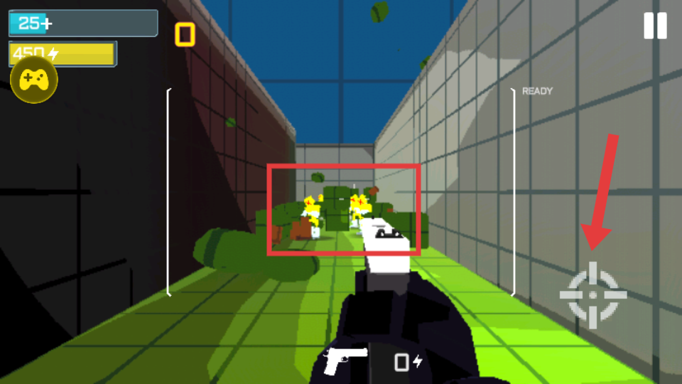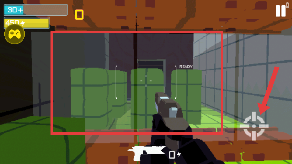 2、在战斗场景中,瞄准红色方框内的敌人射击,同时可点击右侧瞄准按钮辅助瞄准,提升射击精准度。