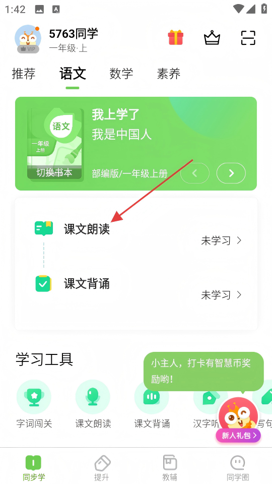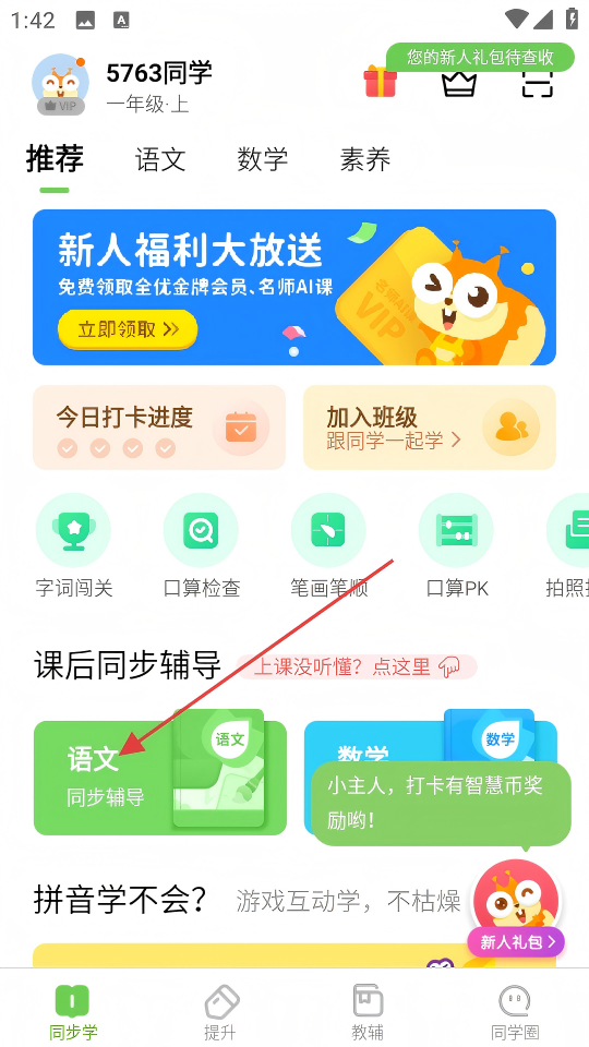 1、在首页课后同步辅导区域,点击【语文同步辅导】,可进入语文学习板块。