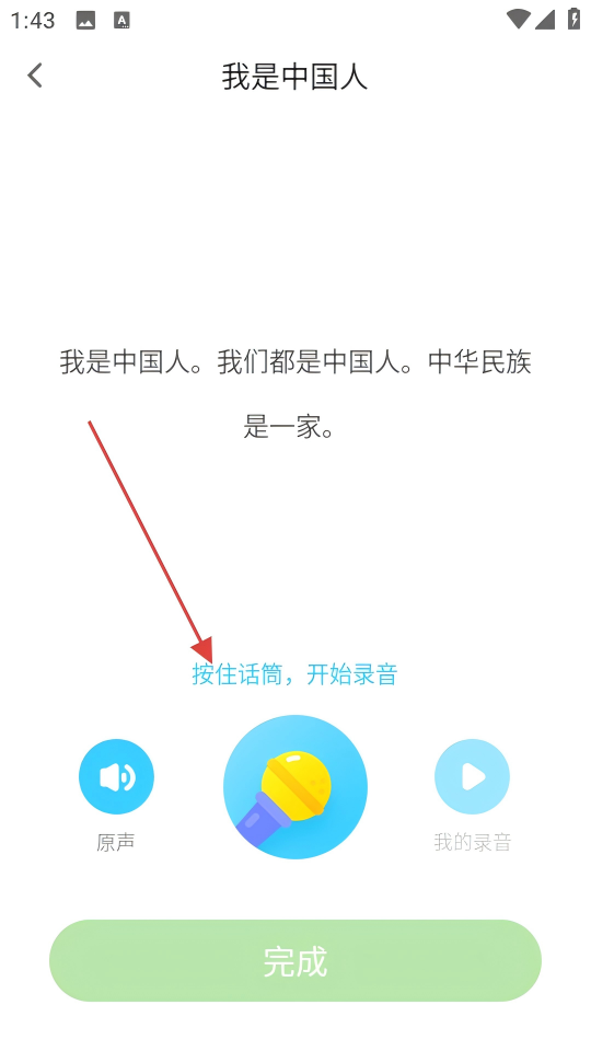 4、在朗读页面,按住话筒图标可开始录音,录音完成后点击【完成】即可。