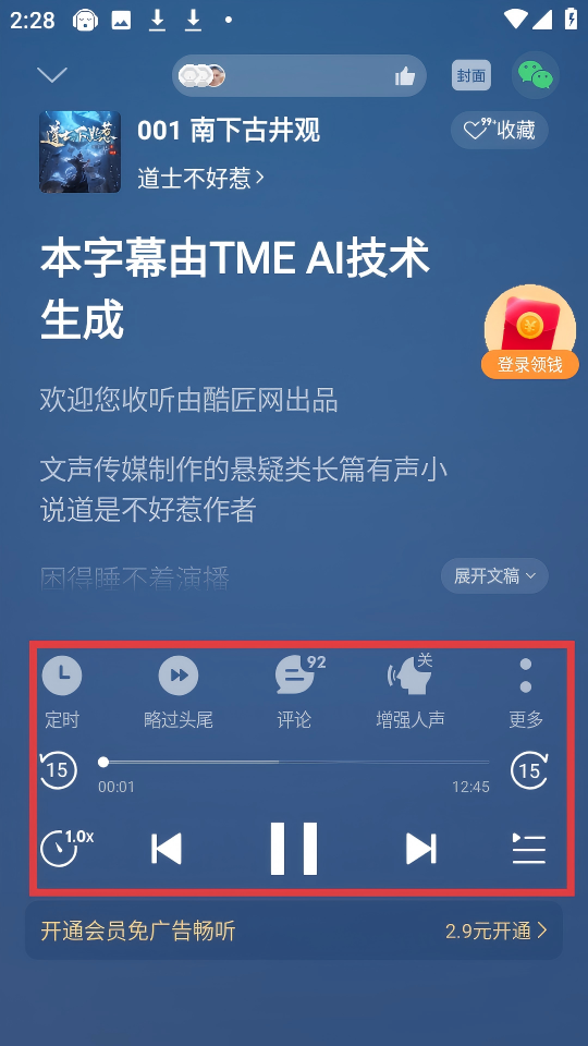 4、在有声小说播放页,可通过【定时】【略过头尾】【评论】等功能进行播放操作。