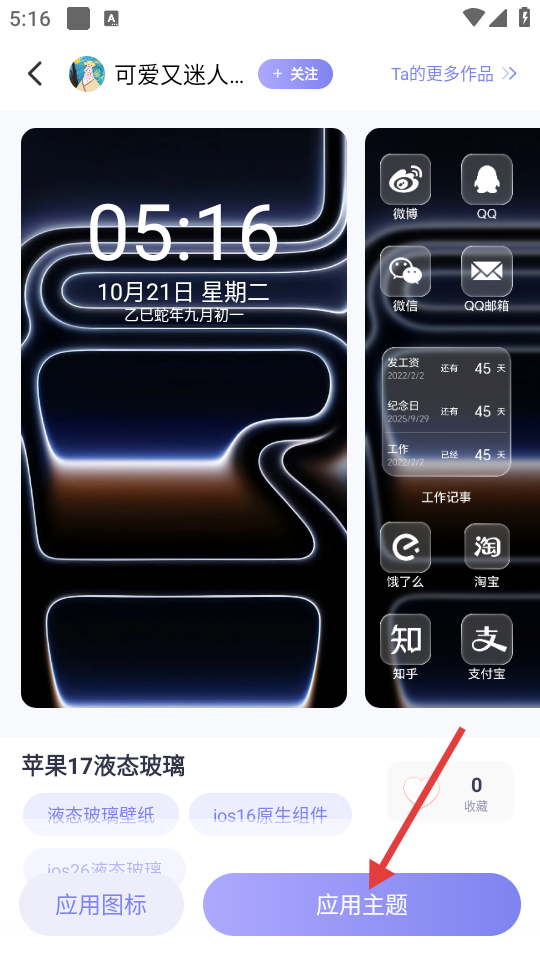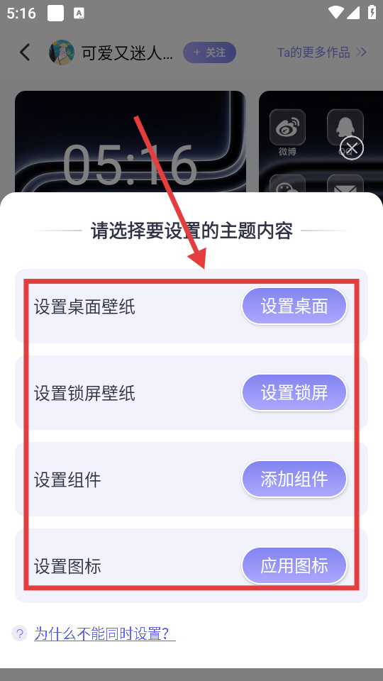 4、在设置选项中,可选择设置桌面壁纸、锁屏壁纸、组件、图标等,根据需求点击对应按钮完成设置。