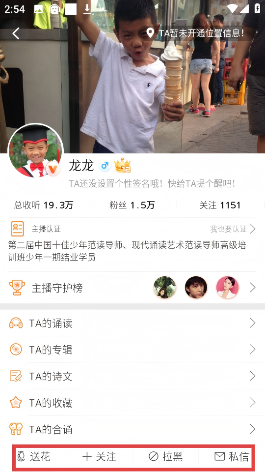 4、进入【龙龙】主播主页,可查看其总收听、粉丝等数据,还可进行送花、关注、私信等操作。