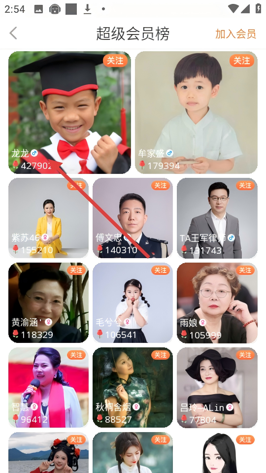 3、查看【超级会员榜】,可了解会员排名情况,点击头像可进入主播主页。