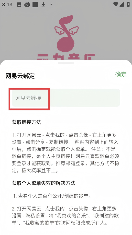 4、在【网易云绑定】中输入【网易云链接】,按【获取链接方法】操作复制个人主页链接后点击确定即可获取歌单。