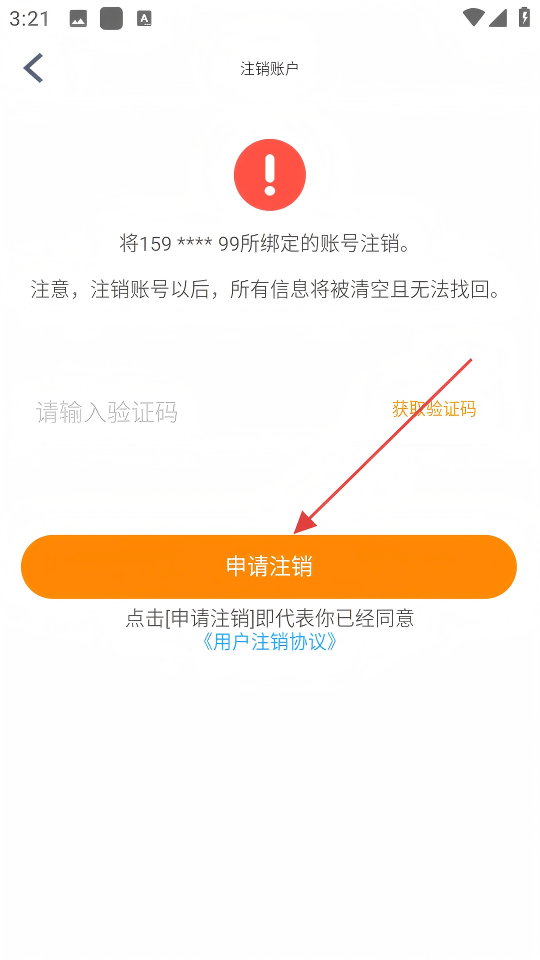 4、在注销账户申请页,获取并输入验证码后,点击【申请注销】可提交账号注销申请。