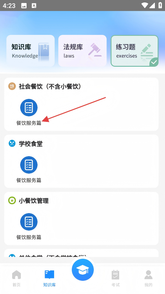 2、在知识库页面,选择【社会餐饮】分类下的【餐饮服务篇】,进入练习题页面。
