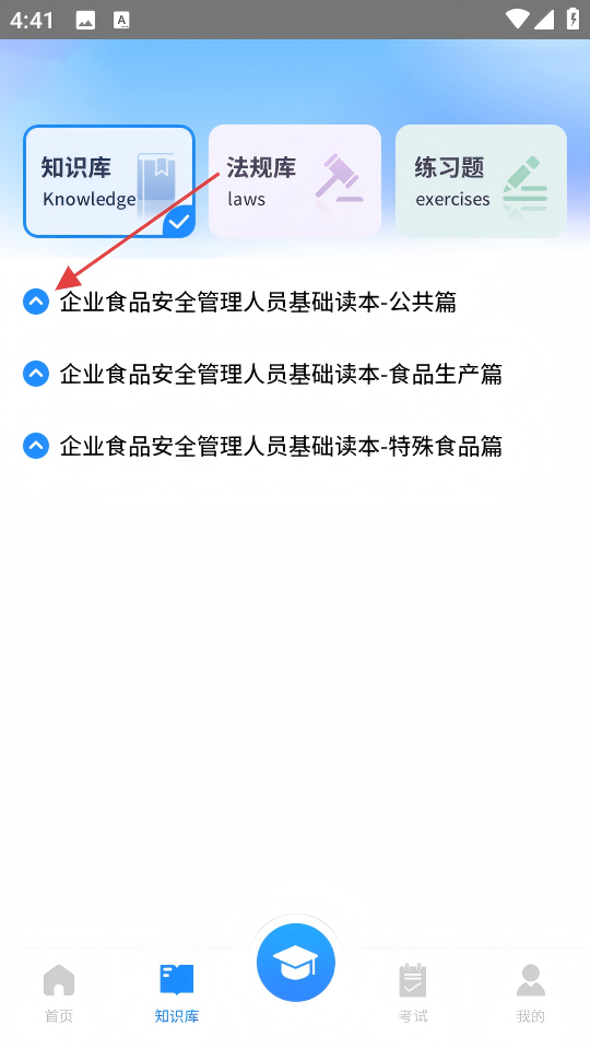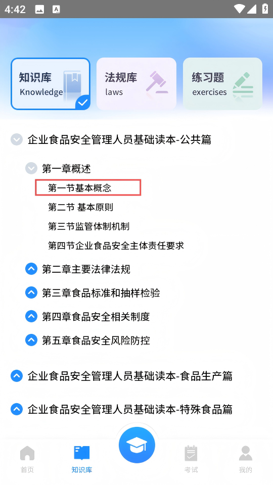 2、在知识库页面,点击【企业食品安全管理人员基础读本-公共篇】,展开其章节列表。