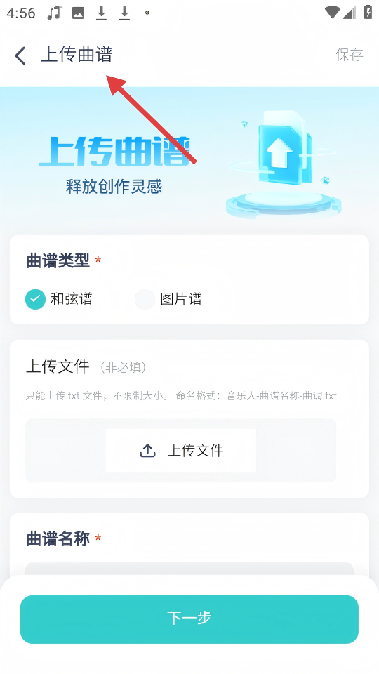 4、在【上传曲谱】页面可进行曲谱类型选择、文件上传等操作。