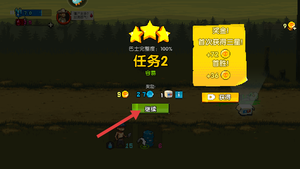 4、点击【继续】,领取奖励,继续游戏,推进任务进程。