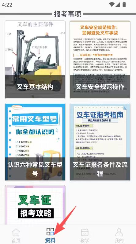 1、进入资料板块,可查看叉车基本结构、安全规范操作等理论知识及报考指南。
