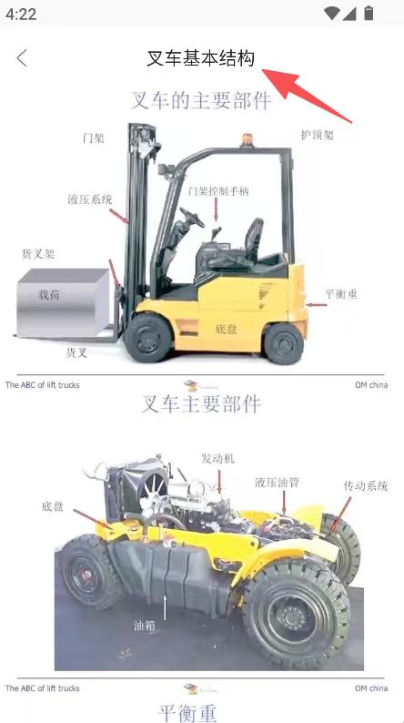 1、理论知识直观,叉车基本结构等内容以图文形式呈现,便于学习者理解叉车部件与构造。