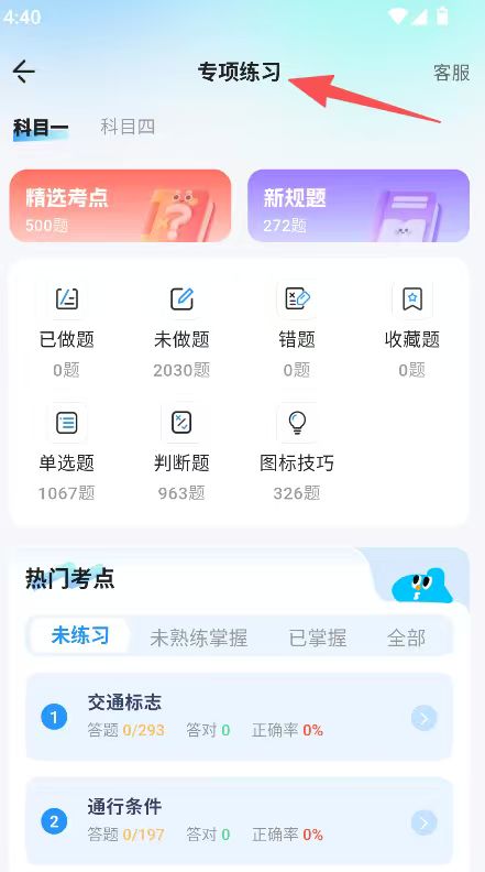 1、进入专项练习板块,选择科目一或科目四,可进行精选考点、新规题练习。