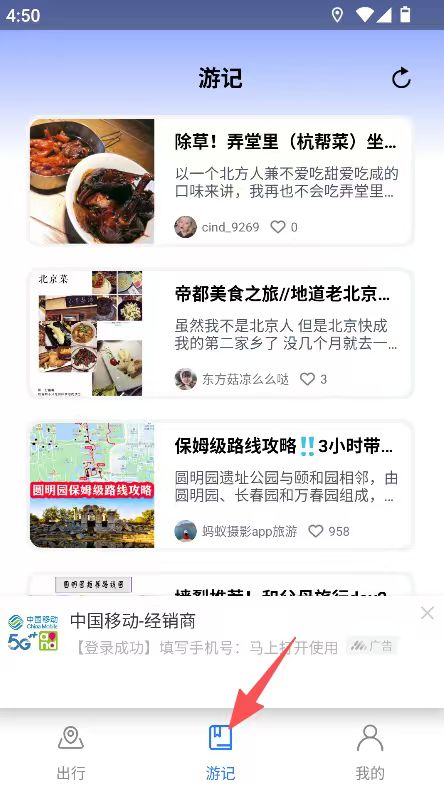 1、进入游记板块,可浏览各地美食、路线攻略等游记内容。