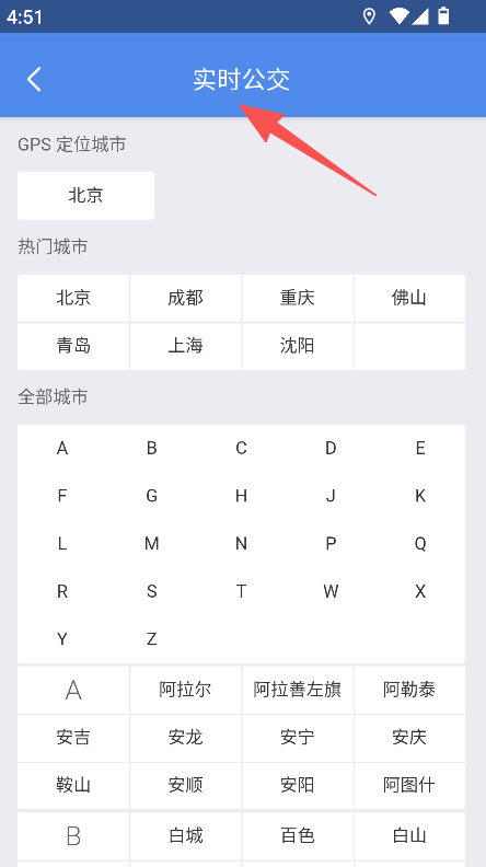 3、进入实时公交板块,可选择城市查询公交实时信息。