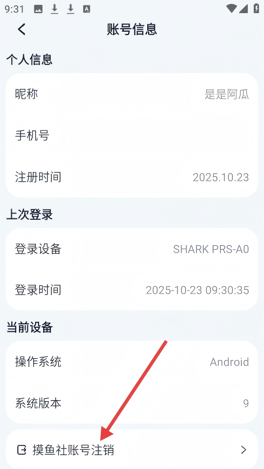 4、在账号信息页面点击【摸鱼社账号注销】,可进行账号注销操作。